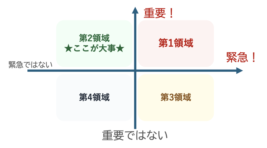 日々発生する緊急タスクを処理することは、火事を消して回るようなものです。もちろんそれも大事ですが、本当に価値があるのは、そもそも火事が起きないように、仕組みを考え、知識を蓄え、備えること(=第2領域の仕事)ではないでしょうか。
